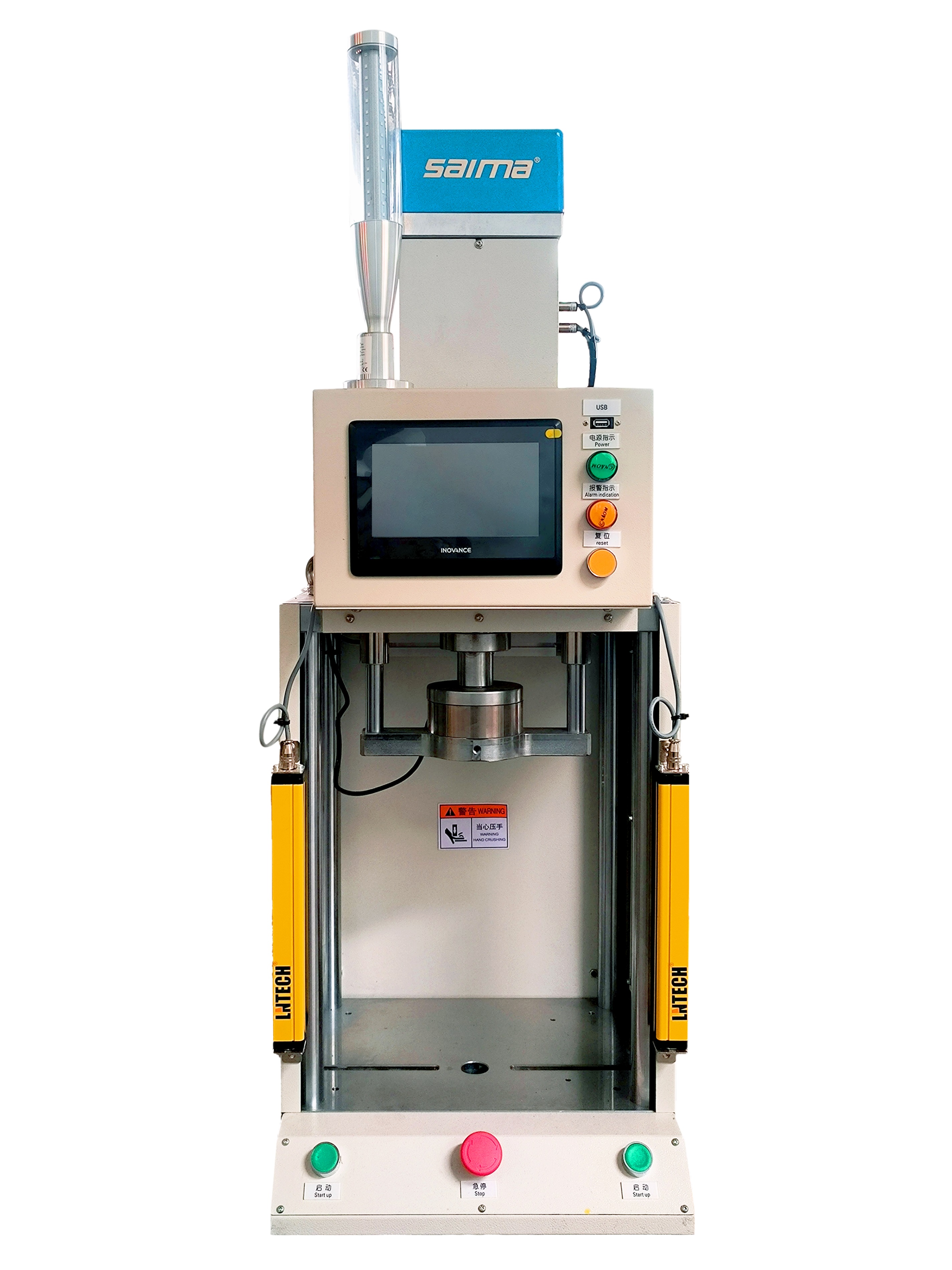 1 :標(biāo)準(zhǔn)伺服壓力機(jī)采用四柱機(jī)身構(gòu)造,剛性好,最大程度上保障了整體結(jié)構(gòu)的牢固和安全性,可隨時(shí)移動(dòng),在桌面放置,占地面積小。
